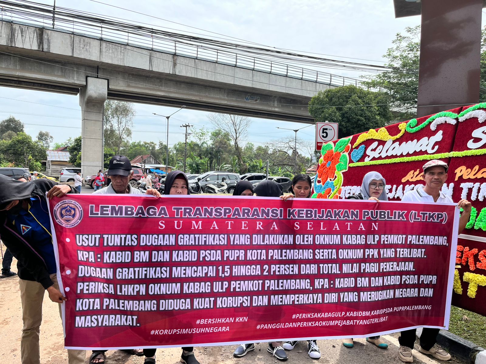 Koordinator aksi Maulana AHA, SH menyampaikan bahwa berdasarkan hasil temuan di lapangan, praktik gratifikasi tersebut diduga melibatkan oknum Kabag ULP Pemkot Palembang, Kabid Bina Marga (BM), Kabid PSDA PUPR Kota Palembang, serta PPK berinisial T.